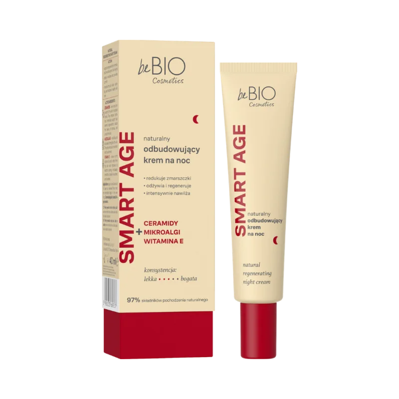 beBIO taastav öökreem Smart Age on intensiivselt taastav vananemisvastane kreem, mis on loodud küpsele 40+ nahale. Selle rikkalik koostis keramiidide, mikrovetikate ja E-vitamiiniga toetab naha hüdrolipiidbarjääri taastamist, parandab elastsust ning aitab vähendada nähtavaid vananemismärke.