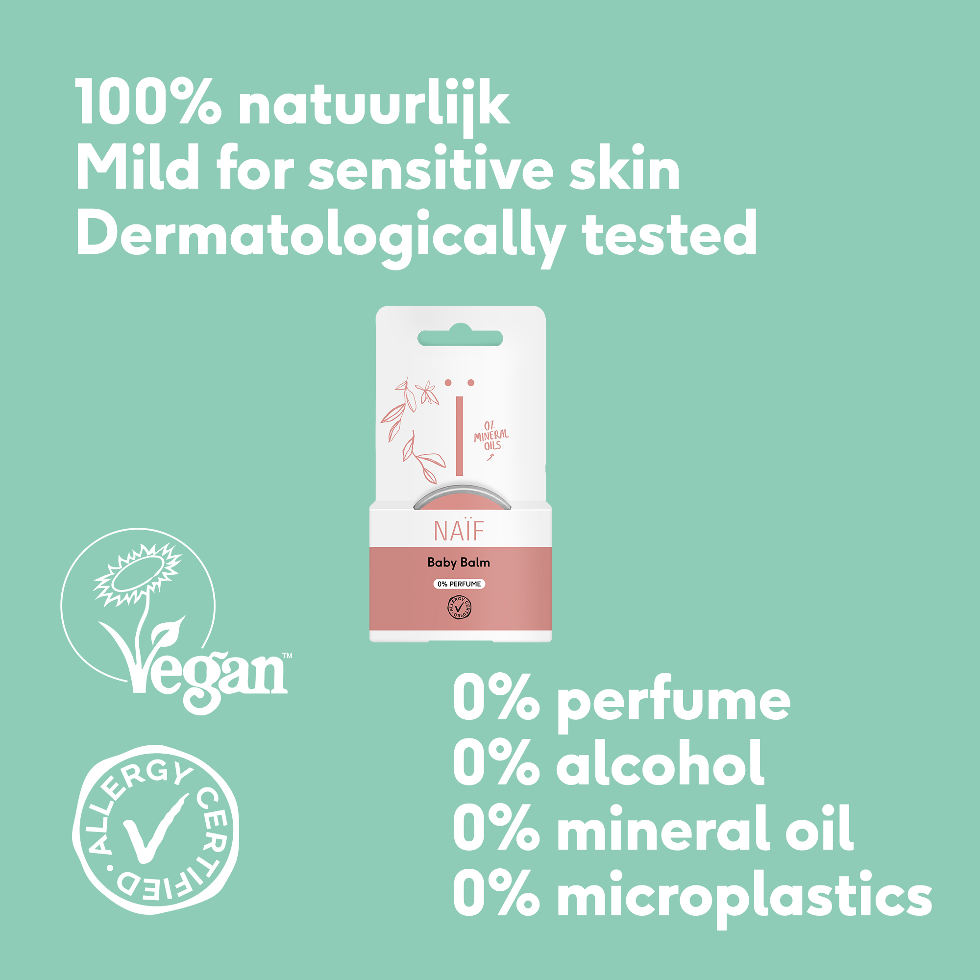 Naïf Baby Balm 0% Perfume on mitmeotstarbeline salv, mis moodustab kuival (beebi) nahal kaitsekihi ning aitab niiskust nahas hoida. Naïf beebisalv ei sisalda lisatud lõhnaaineid ega vaseliini, parafiini või mineraalõlisid, mis võivad häirida naha loomulikku kaitsebarjääri. Selle asemel sisaldab see sheavõid ja kookosõli, mis moodustavad nahale kaitsekihi ning hoiavad naha pehme ja elastse. 100% looduslikku päritolu koostisosad. Allergiasertifikaadiga.
