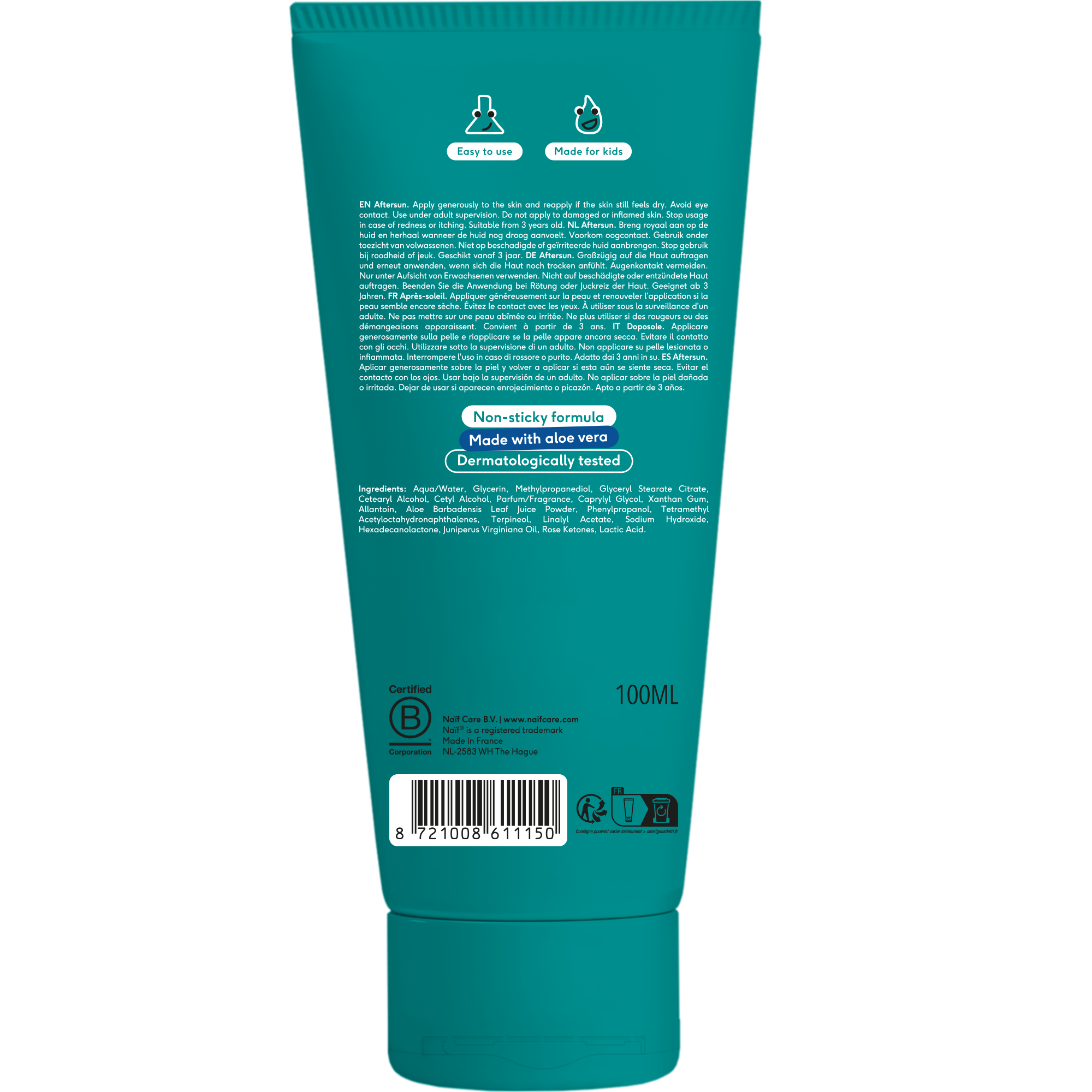 Sobib nii lastele kui täiskasvanutele. Aloe vera aitab rahustada punetavat nahka ning leevendab UV-kiirgusega kaasnevat nahaärritust. NAÏF päevitusjärgne kreem on mõeldud kasutamiseks nii näol kui kehal.