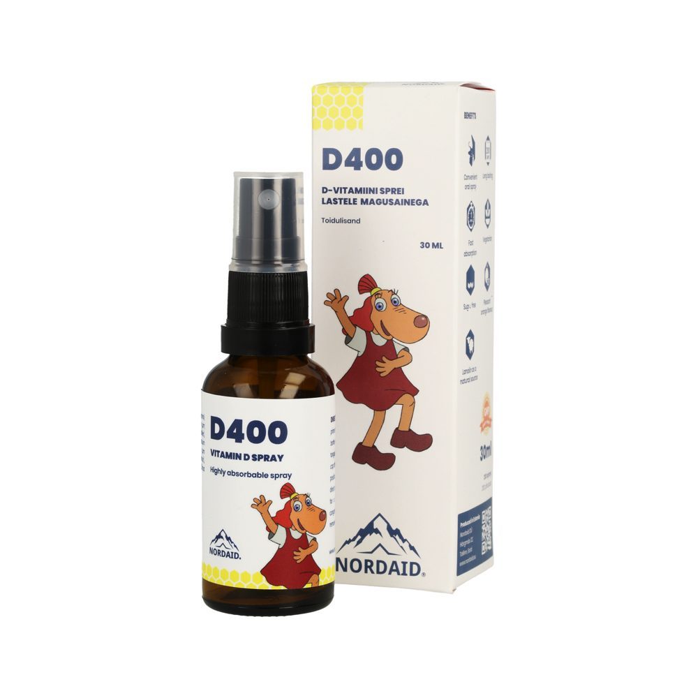 Nordaid´i D400 sprei on kergesti omastatav, kuna jõuab läbi lapse suu limakesta koheselt vereringesse.Vitamiin D aitab hoida luid ja hambaid tugevana ning toetab lapse immunsüsteemi normaalset talitlust.