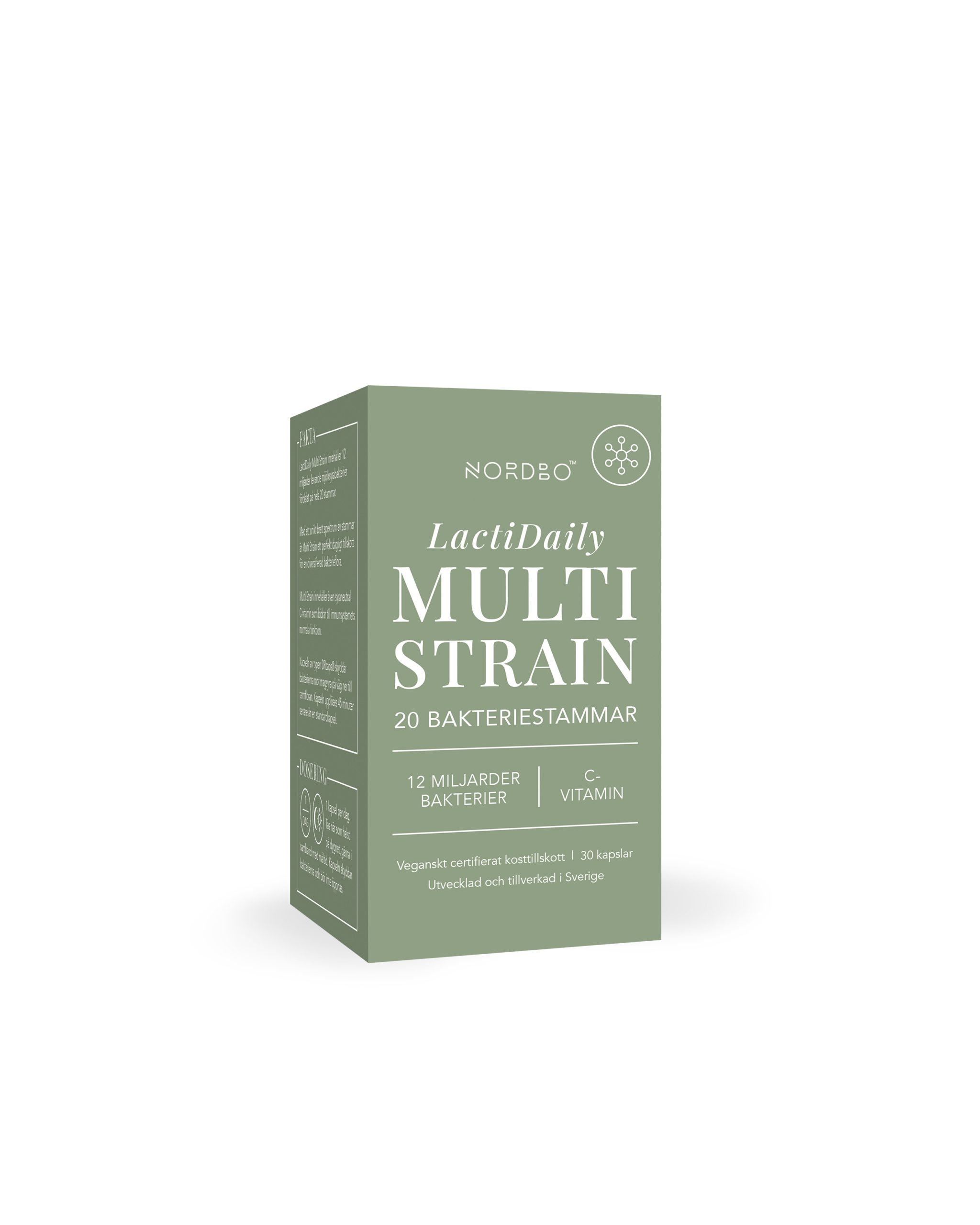 Multi Strain on vegan-sertifikaadiga ning sertifitseeritud organisatsiooni Swedish Animals’ Rights poolt. Toode ei sisalda loomseid koostisosi ega gluteeni, suhkrut, soja ega laktoosi.