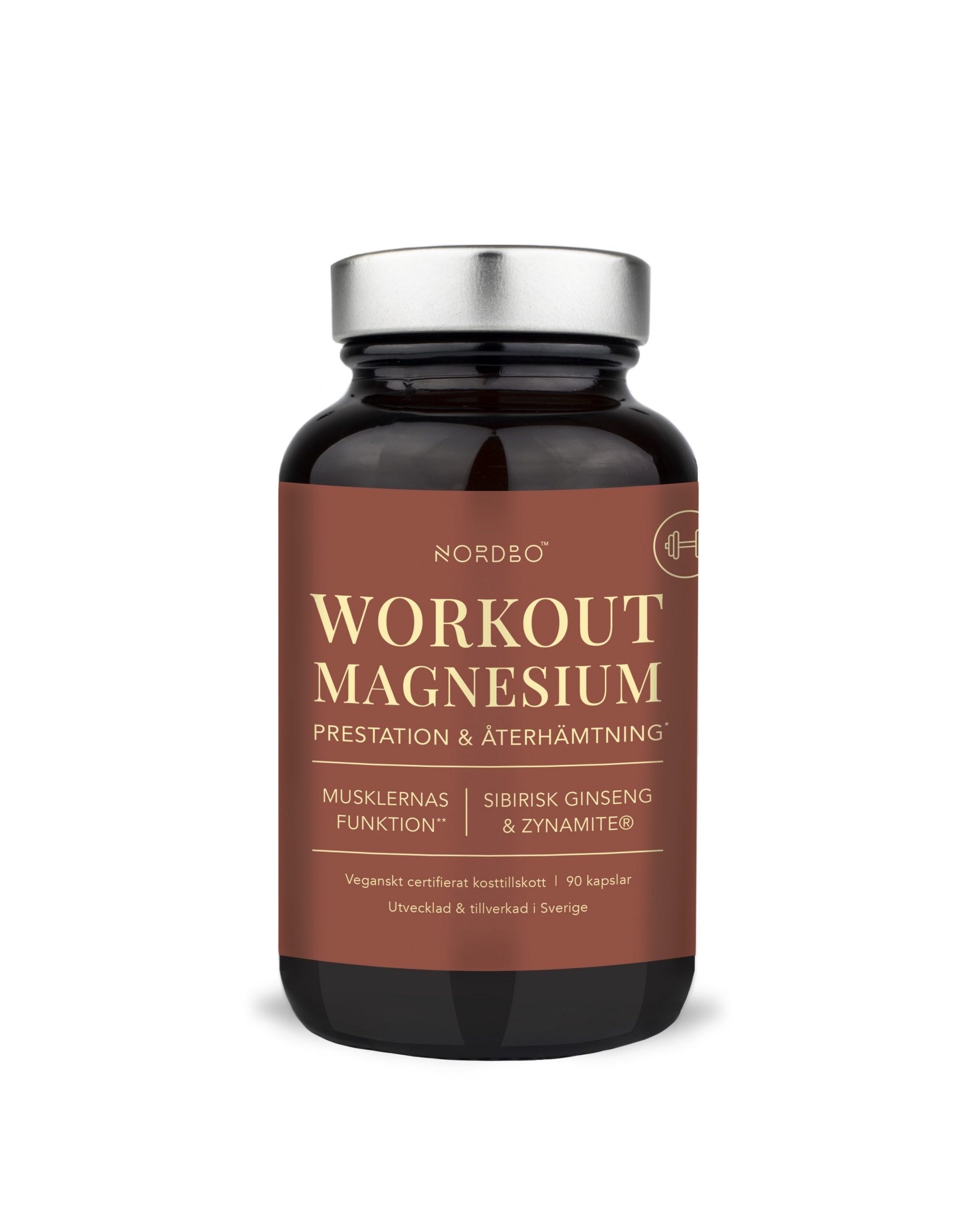NORDBO Workout Magnesium sisaldab viit koostisosa: magneesiummalaat, magneesiumbisglütsinaat, Siberi ženšenn, Zynamite® ja DigeZyme®.