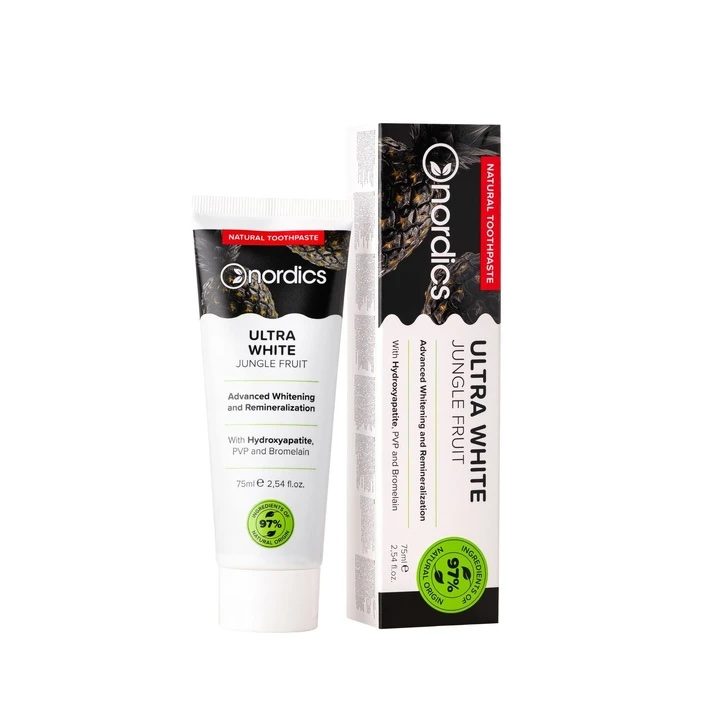 Nordics hambapasta ULTRA WHITE JUNGLE FRUIT. See remineraliseeriv hambapasta sisaldab üle 97% loodusliku päritoluga koostisosi, sealhulgas tugevaid valgendajaid. Tooted sisaldavad hüdroksüapatiiti (vedelat emaili), PVP-d (polüvinüülpürrolidoon), ja bromelaiini (ananassi ensüüm). See võimas koostisosade kombinatsioon muudab Su naeratuse säravamaks. Ilma fluoriidita, SLS-i ja suhkruta. Sobib veganitele.