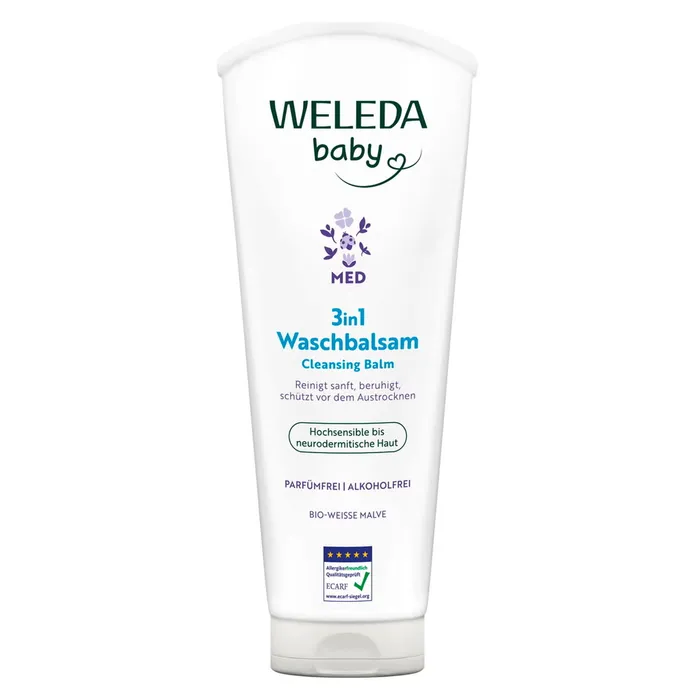 Puhasta oma beebi tundlik või atoopiline nahk Weleda Baby Med 3in1 Weisse Malve pesupalsamiga.
